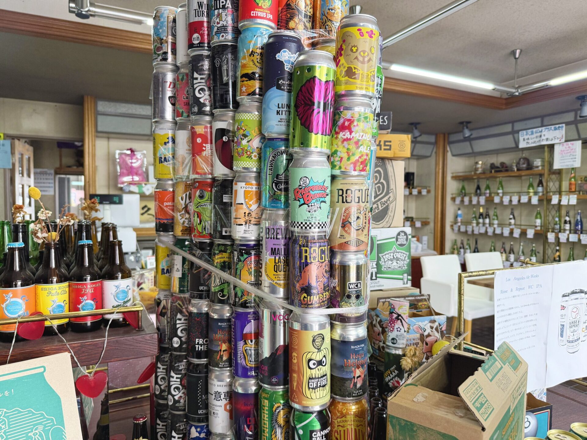 お店を入って目の前にはたくさんのクラフトビールの缶が聳え立っています!これだけでもわかる店主さんのクラフトビール愛!どの銘柄が入荷しているかは行ってみてのお楽しみ。どんなビールとの出会いがあるか、これも一つの旅の醍醐味ですね。